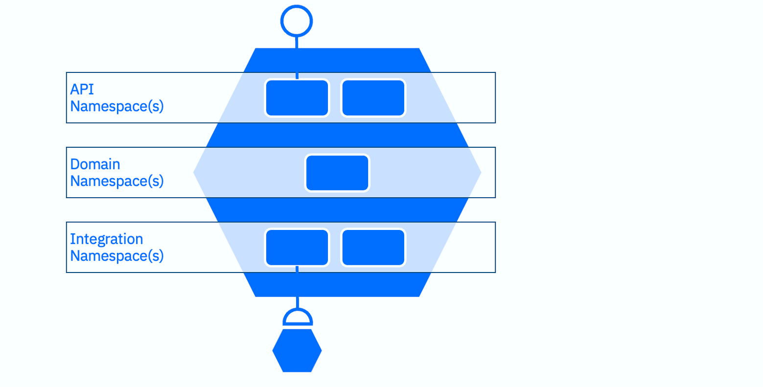Integration namespaces manage interactions with other services, acting as a connectivity or anti-corruption layer, while abstracting away technical integration details.